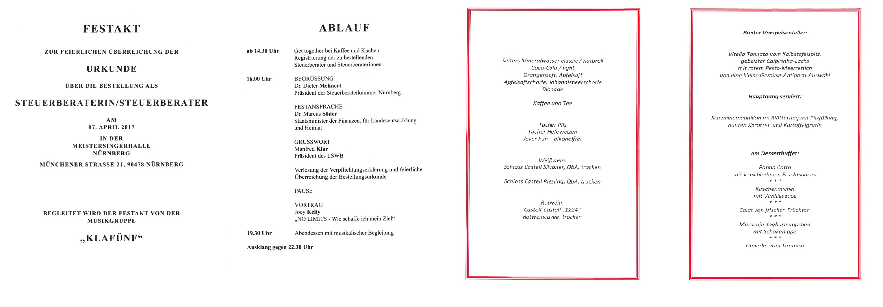 Die Festreden waren sehr langatmig. Herr Dr. Söder war verhindert, was allerdings den „Schlagabtausch“ Kammer vs. Finanzverwaltung nicht verhinderte, gefolgt von einem gefühlten Werbeblock vom LSWB. Leider ging es hier allgemein vorrangig um Politik und kaum um uns, die wir doch an diesem Tag gefeiert werden sollten. Empfand ich als sehr schade und wir hatten ja auch steuerlich nicht vorgebildete Begleitungen dabei, die taten mir fast schon leid. Aber man konnte sich ja anhand des Ablaufs schon auf so etwas einstellen. Interessante Infos: Die endgültige Bestehensquote in Nürnberg war 46%, München nur 39%. Zufrieden war damit keiner und es wurden wieder die langfristigen Pläne zwecks der zukünftigen Prüfungsgestaltung angesprochen. Es sollen z. B. die Praxiszeiten für Steuerfachangestellte (8 statt 10 Jahre) und Steuerfachwirte (5 statt 7 Jahre) verkürzt werden -> halte ich persönlich für wenig sinnvoll. Rückblickend betrachtet habe ich meine Praxiszeiten gebraucht und viele Sonderfälle schon einmal gesehen, die mir in der Prüfung geholfen haben. Es wird diskutiert, BWL als festen Prüfungsbestandteil zu integrieren (im Hinblick auf dann erweiterte Befugnisse eines Steuerberaters) und dass man gute Teilnoten einer insgesamt vergeigten Prüfung auf den nächsten Prüfungstermin übertragen kann. Auch sollen die Klausuren wieder veröffentlicht werden. Aber das sind alles nur Überlegungen.