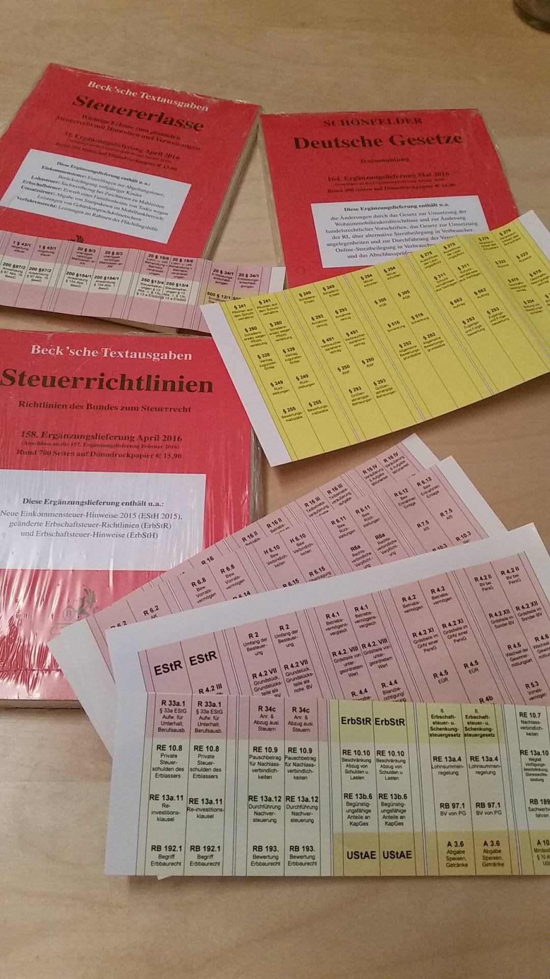 Über das Einsortieren gibt es ja unzählige Empfehlungen usw. Ich mache das nun so, einsortiert wird alles, nur schaue ich genau, ob und was ich aussortiere. Wird schon passen und meine Blöcke sind trotzdem auf dem aktuellen Stand und ich kann das 2015er Recht parallel sehen und der Rechtsstand wurde farblich gekennzeichnet. Je nach Fach und Aufgabenstellung brauche ich ja beides oder nur das alte (Bew/ErbSt-Tabellen usw.).