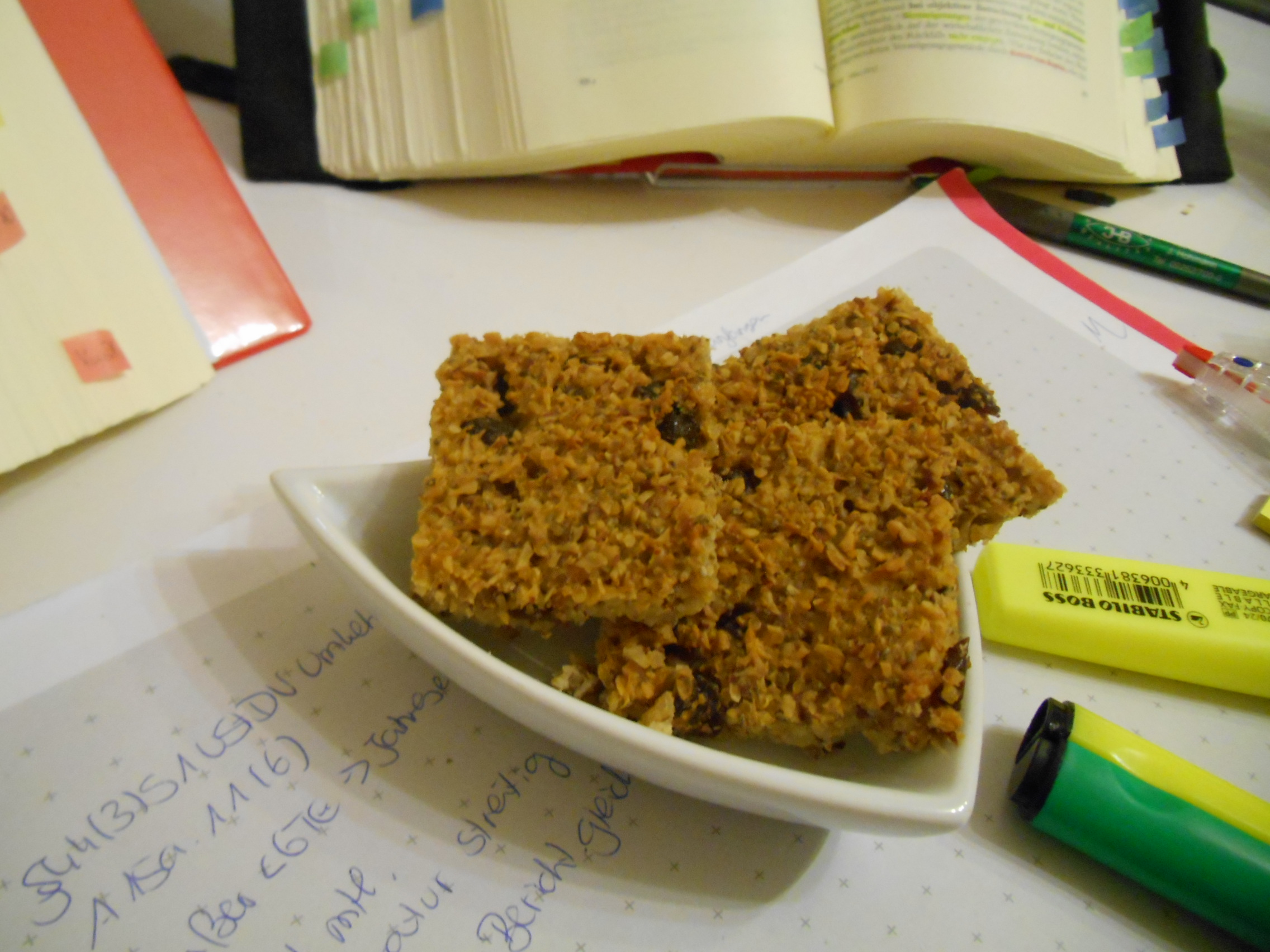 DSCN2733Gestern z.B. habe ich in meinem Schrank Quinoa gefunden und im Internet ein Rezept für Müsliriegel. Links seht ihr das Ergebnis. Einige habe ich heute schon während der Knoll-Klausur VerfR 06 vernascht.