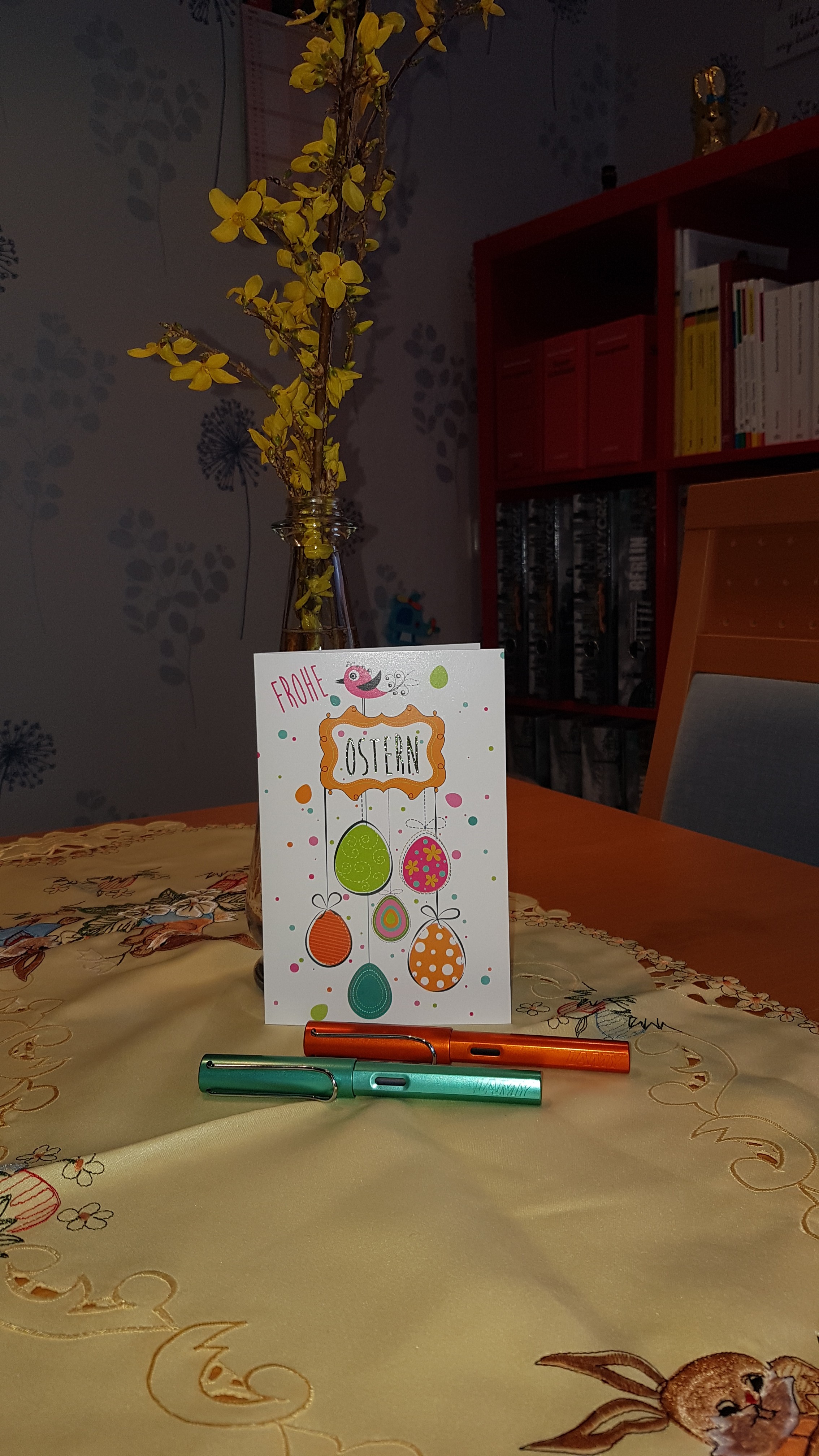 Gestern Abend sind wir wieder zu Hause angekommen. Zwar warten ein riesiger Wäscheberg und zwei Knoll Klausuren auf mich, aber ich fühle mich im Augenblick gut erholt. Auf die Klausuren freue ich mich richtig, der Osterhase hat mir nämlich auf dem Esszimmertisch einen neuen Füller gelegt. Ich habe mich riesig gefreut. Den orangenen Lamy Füller im Bild habe ich zum Beginn des Steuerfachwirts von meinen Kollegen zum Geburtstag bekommen. Die Tinte ist, wie der Füller, orange. Ich nutze diesen zum Kennzeichnen in den Skripten und den Klausuren. Das funktioniert ganz gut. Bei der Steuerfachwirtprüfung habe ich in den Klausuren den Schneider Slider Rave XB genutzt. Aber nach zwei Tagen hatte ich Probleme den Stift noch zuhalten und er hat angefangen zu schmieren. Zum Glück hatte ich eine Ersatzmine dabei. Ich wollte nun versuchen wieder die Klausuren klassisch mit Füller zu schreiben. Das hat im Abitur schließlich auch gut geklappt. Den Kuli habe ich aber für den Notfall immer noch griffbereit.